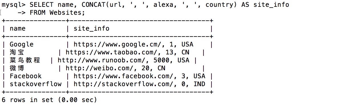 在下面的 SQL 语句中,我们把三个列(url、alexa 和 country)结合在一起,并创建一个名为 "site_info" 的别名: