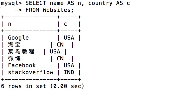 下面的 SQL 语句指定了两个别名,一个是 name 列的别名,一个是 country 列的别名。提示:如果列名称包含空格,要求使用双引号或方括号: